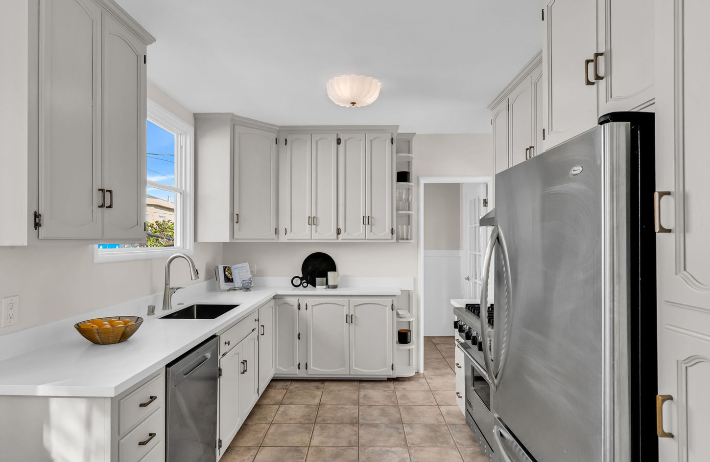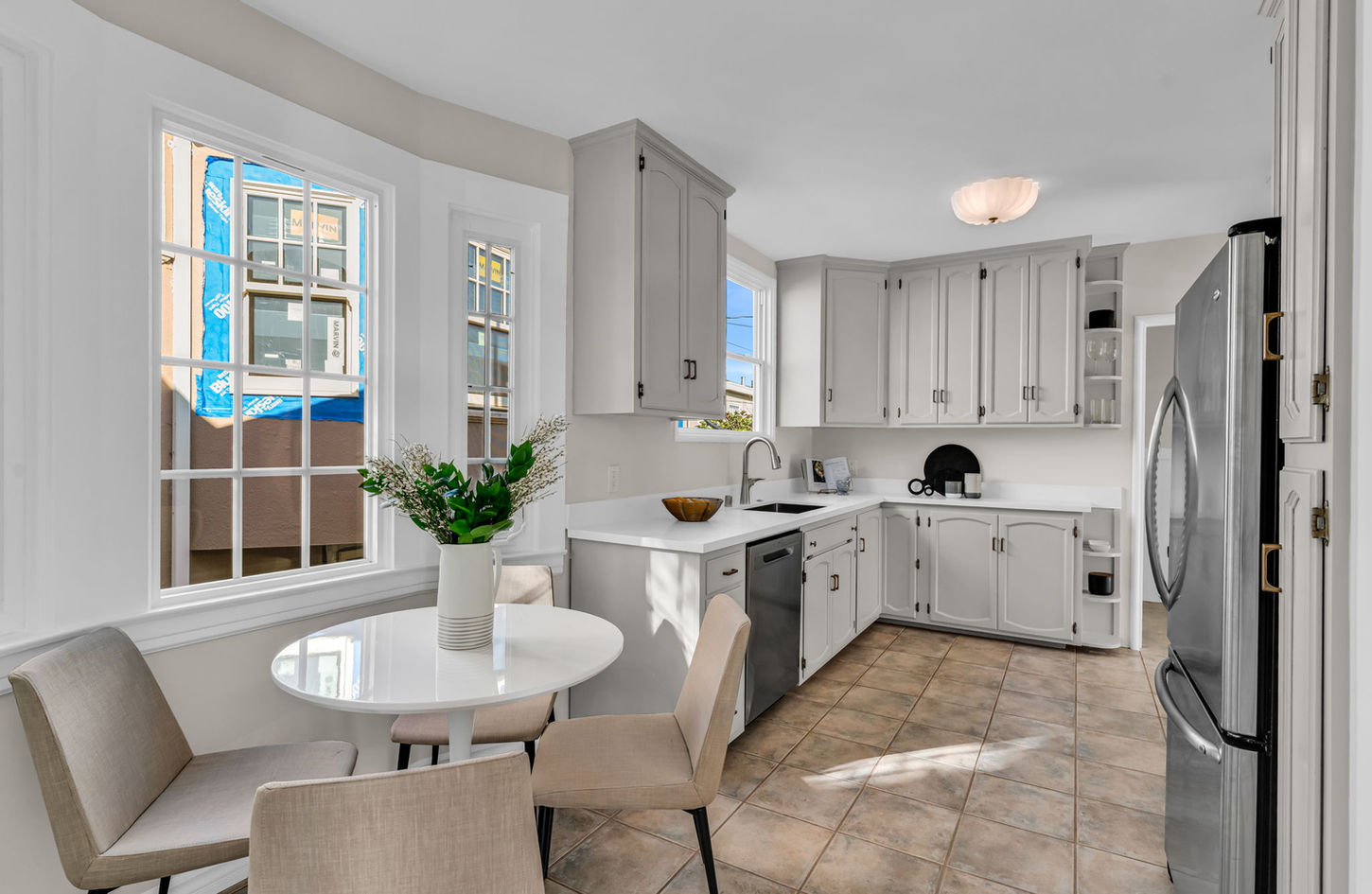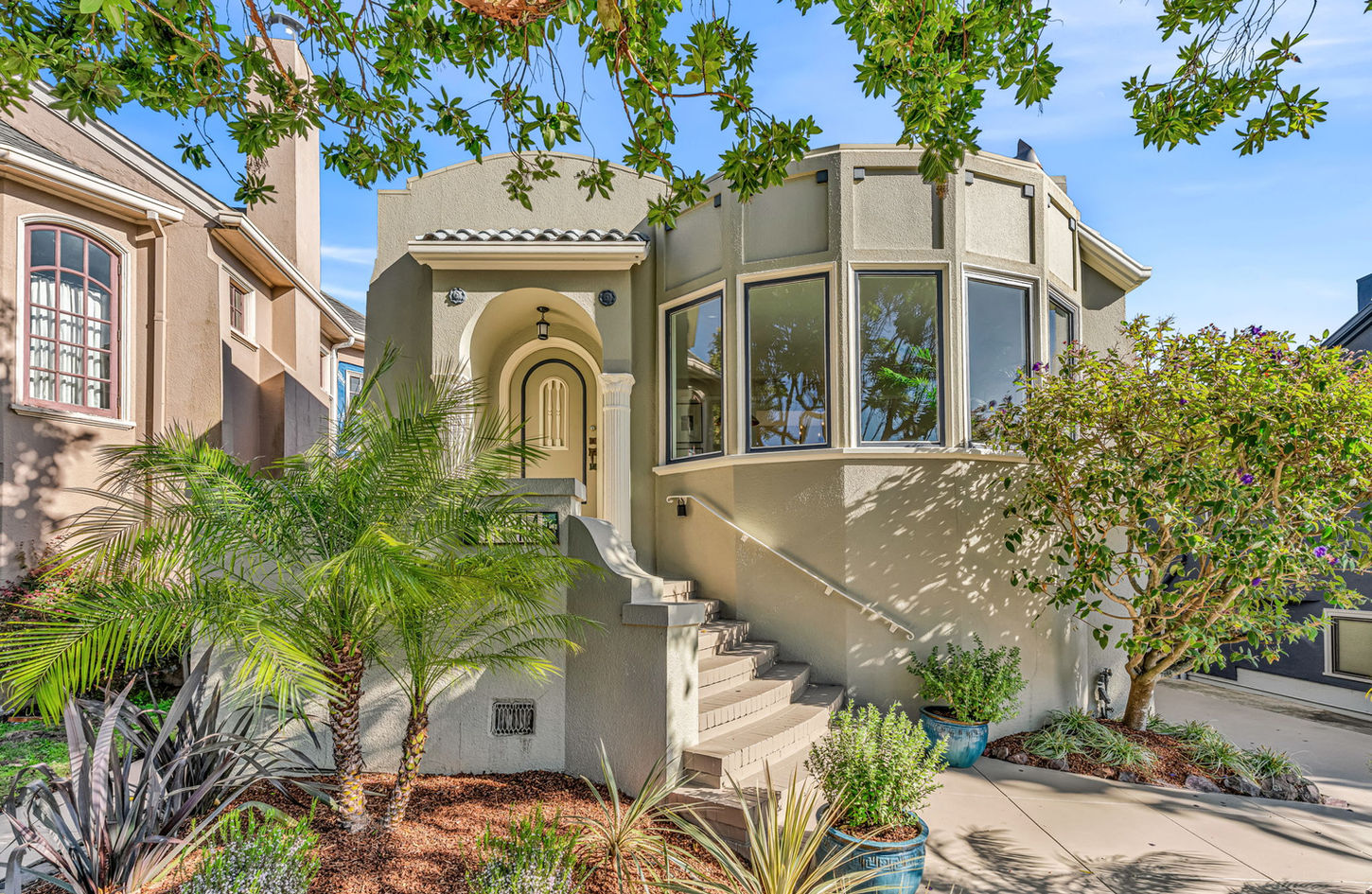 This charming Craftsman home built in 1923 is nestled on a wonderful block in the heart of the neighborhood, close to parklets and public transportation! A splendid garden entrance with inviting walkway and curved brick staircase leads to a sophisticated columned portico with notable arched front door and into a gracious foyer with convenient coat closet. The magnificent formal living room with coved, recessed ceiling and gleaming hardwood floors boasts a gorgeous wood-burning fireplace with original Batchelder tile hearth and surround, classic mantel, built-in bookshelves and a huge five-sided bay window with picturesque views of hills and trees. The spectacular, light-filled formal dining room with tray ceiling, striking chandelier and stunning built-in buffet with expansive mirror is perfect for entertaining! The tastefully remodeled gourmet kitchen with delightful breakfast area, bay window and beveled glass doors showcases all stainless-steel appliances including a Viking Professional gas range with Vent-A-Hood, Amana refrigerator and GE dishwasher, quartz counters, custom designer color painted wood cabinets and an open walk-in pantry.