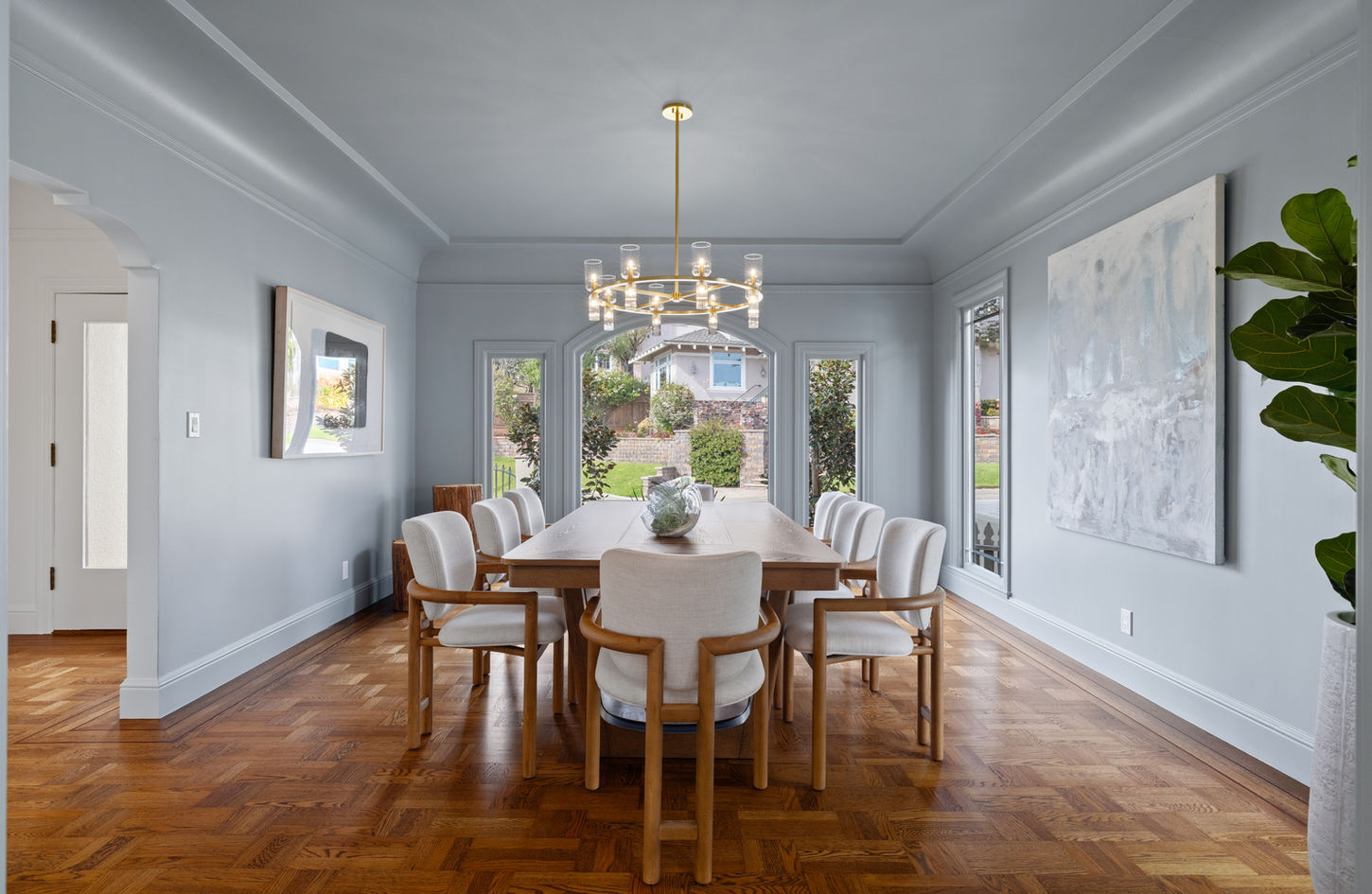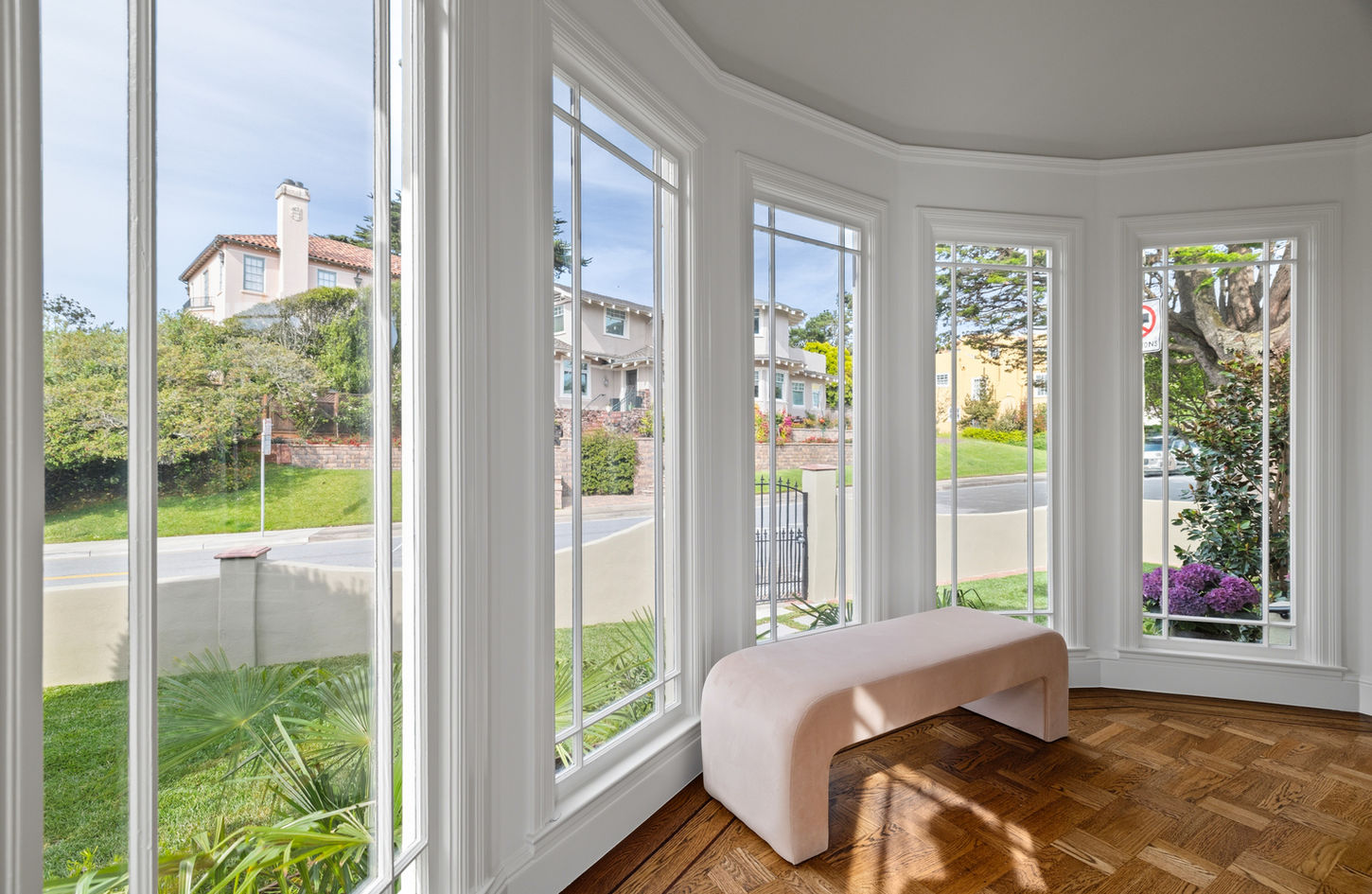 This magnificent Spanish Mediterranean home built in 1927 is proudly situated on a great block in the heart of the neighborhood, close to Stonestown Galleria and public transportation! An impressive, gated courtyard with stepping stone pathway, garden entrance and terrazzo staircase leads to a splendid portico with notable front door and into a lobby-like foyer with center-hall floor plan and convenient coat closet. The grand formal living room with high barrel ceiling and phenomenal half dome, five-sided bay window boasts an imposing fireplace with classic mantel and original Batchelder tile surround, chic wall sconces, crown moldings and gorgeous parquet hardwood floors. The stunning, banquet-sized formal dining room which features recessed lighting, a striking chandelier and an arched picture window is perfect for entertaining! The beautifully updated gourmet kitchen with wonderful, adjacent breakfast room, built-in buffet and recessed lighting showcases all stainless-steel appliances including a GE four-burner gas range with griddle, oven and hood, a Whirlpool refrigerator and Maytag dishwasher, quartz counters, custom-painted wood cabinets with snazzy hardware, nice pantry and enclosed laundry area. An expansive hallway with linen closet, three huge bedrooms - two with views to the Pacific Ocean - and a handsome updated bath finish this floor.