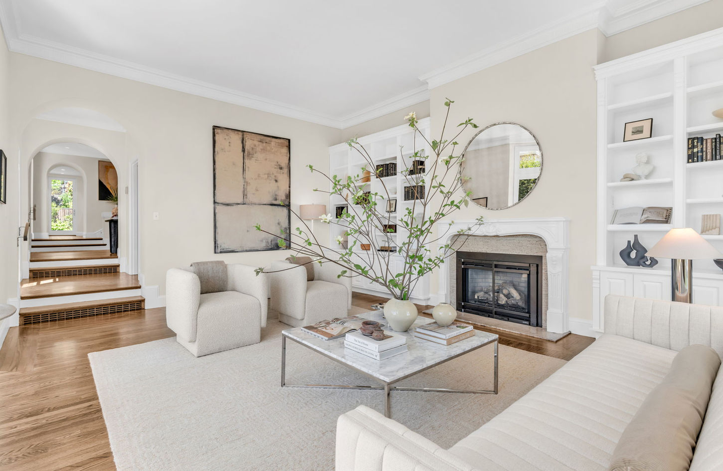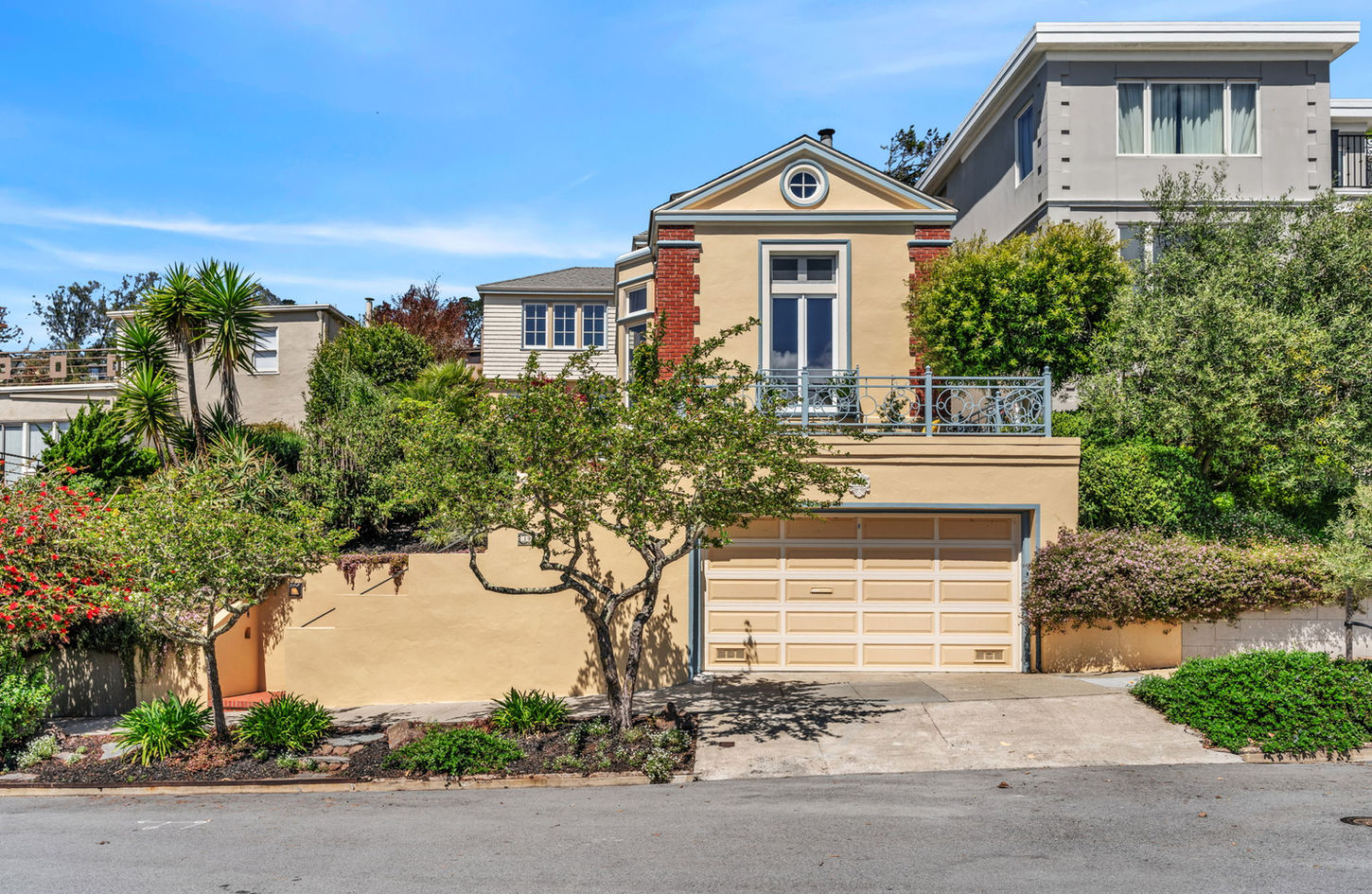 This timeless remodeled Georgian Colonial Revival home built in 1937 with classic brick detailing is proudly situated on a wonderful tree-lined block in the heart of the neighborhood, close to West Portal Village shops, restaurants, coffee houses and Muni Station! A handsome brick staircase leads to an inviting walkway with storybook garden entrance and traditional portico with notable front door and into a gracious foyer with center hall floor plan, cloak closet and delightful powder room. The grand, step-down formal living room with arched entry, high ceiling, crown moldings and hardwood floors boasts a gas fireplace with distinguished mantel, marble surround and built-in bookshelves on either side, a picture window with a decorative outside balcony and a huge bay window that offers gorgeous views of the front garden and the Pacific Ocean. The fantastic formal dining room with recessed lighting, built-in buffet, chic two-sided gas fireplace with marble surround and two 15-paned windows with picturesque outlooks of mountains, hills and trees is perfect for entertaining! The phenomenal remodeled gourmet kitchen with recessed lighting showcases an enormous work island with pendant lights, breakfast bar, prep sink and ample storage, all stainless-steel appliances including a GE Monogram gas range with massive hood, Sub-Zero refrigerator, Bosch dishwasher and built-in Miele double oven, amazing pantry with slide-out drawers, Caesarstone and Neolith stone counters and stunning custom cabinetry with slow-close drawers.