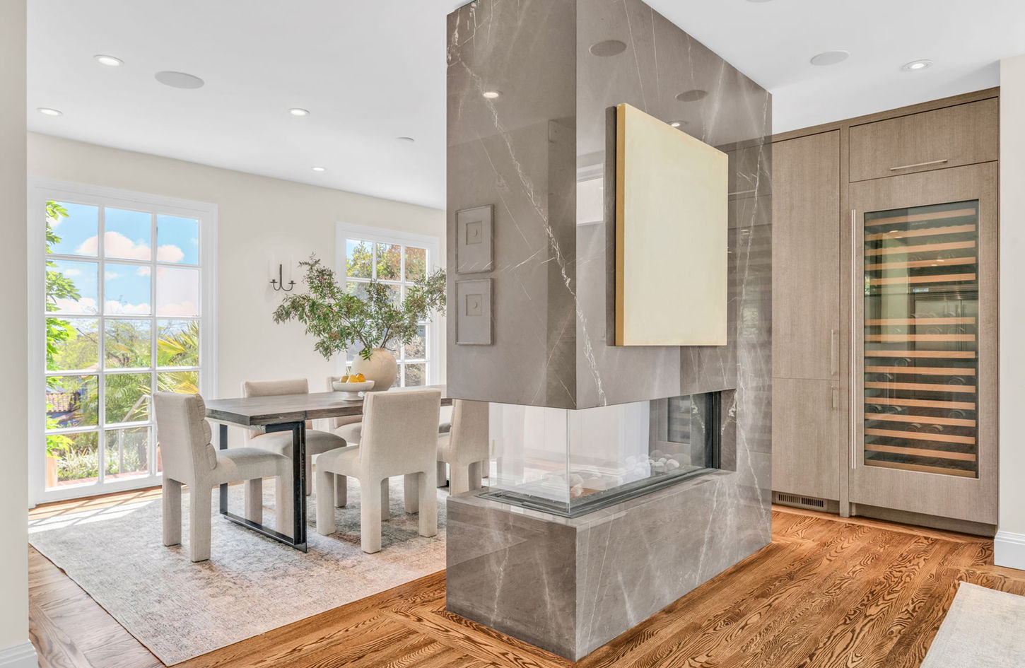 The terrific, light-filled family/ great room opens to a walk-out deck and includes the reverse side of the fireplace, an awesome Sub-Zero wine fridge with slide-out racks, a bank of windows and beautiful views of the lush backyard. A comfortable home office/ 4th bedroom with built-in desk and bookshelves along with an en-suite bath concludes this floor. The impressive open staircase with exquisite wrought-iron railing and carpet runner with stair rods ascends to the upper-level landing with hallway, expansive built-in linen cabinet, convenient laundry area with stacked LG washer & dryer and the home's private living quarters. The sumptuous master suite which enjoys sweeping views from rolling hills to the Pacific Ocean features an extraordinary walk-in closet with custom built-in dresser drawers, clothes and shoe racks and an incredible en-suite marble bath with dual vanity sink, built-in medicine cabinets with lighted mirrors, soaking tub and a separate, luxurious walk-in shower. Two additional good-sized bedrooms - one with a wood-burning fireplace and panoramic views of the Pacific Ocean - and a charming ''Jack and Jill" third full bath with pedestal sink and shower over tub finish this floor. The spectacular, park-like landscaped backyard with walk-out deck, tradesman's entrance, natural stone flowerbeds and splendid, mature plants and trees completes this truly special home!