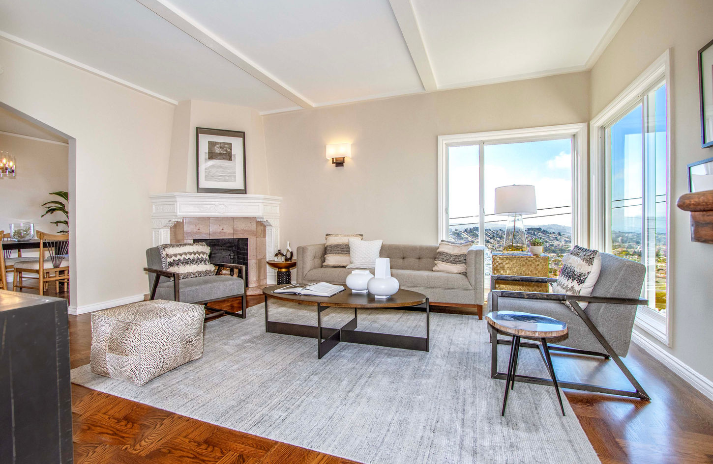 This handsome Traditional sweeping Pacific Ocean view home built in 1938 is nestled in the hills on a wonderful block in prestigious Westwood Highlands! A lovely garden entrance with colorful plants and trees, inviting walkway and terrazzo staircase leads to the classic vestibule and into a terrific foyer with coat closet. The magnificent formal living room with open-beam ceiling boasts a wood-burning fireplace with exquisite original mantel and tile surround, arched doorways, gleaming parquet hardwood floors and large picture windows with stunning views from the Bay to the Olympic Club and the Pacific Ocean. The impressive formal dining room with amazing ocean views and striking chandelier is perfect for entertaining! The nice, light-filled kitchen with fabulous water views to the Bay showcases all stainless steel appliances including a Frigidaire four-burner gas range and refrigerator, and a Maytag dishwasher. Two awesome bedrooms with huge closets and a tiled full bath with shower over tub end this level.